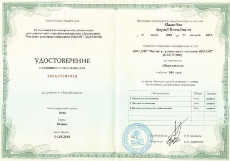 • 2014 - Повышение квалификации: Ростовский государственный медицинский университет (психиатрия-наркология);